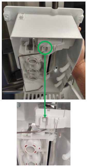 Hold the test button on the bottom of the icemaker for 3-5 seconds or until the icemaker starts to cycle: