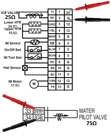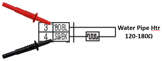 The water lines pass through conduit that are heated to help keep them from freezing. Test the Water Pipe Heater Circuit to make sure it is reading the correct ohm value.