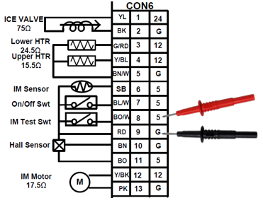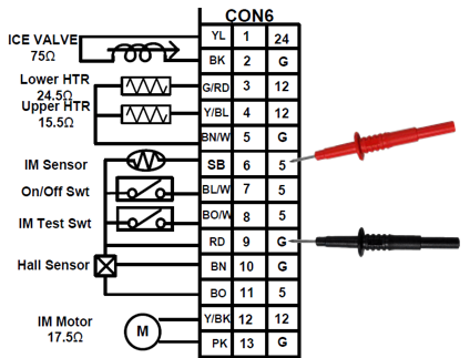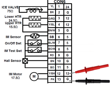 If the test button is working and the icemaker motor does not move at all check to see if the Main PCB is outputting 12Vdc to the motor: