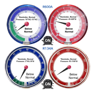 When your run pressures indicate High Side leak it is recommended to pressurize the system to 200 PSI and bubble check all the High Side joints and leak points if the leak cannot be heard or easily found.