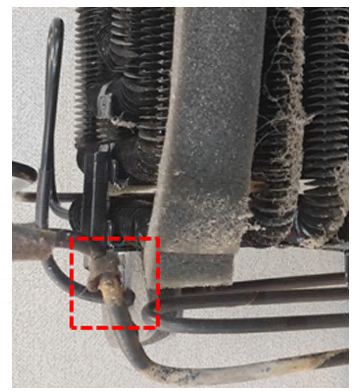 On models with the steel condensers, it was possible for the steel to rust and form tiny leaks in the drain pan area as shown in the below picture: