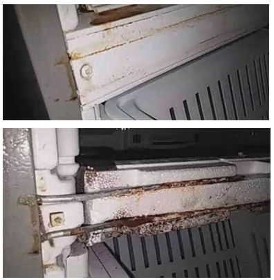 For units with confirmed Yoder Loop leaks there is often external identifiers that point to the yoder being rusted or leaking. Check the cabinet seams around the front of the unit where the yoder is routed for these visual signs. Example:
