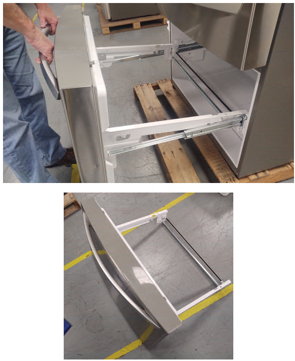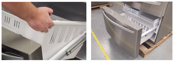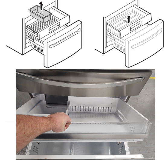 Step 2: Open the freezer door and remove the ice bin and the upper drawer from the unit. Pull toward you and up to remove the drawer: