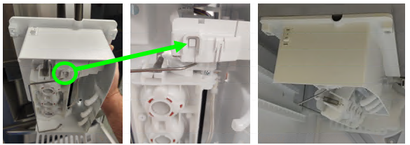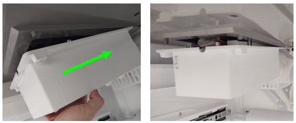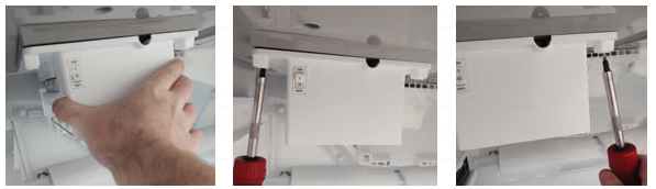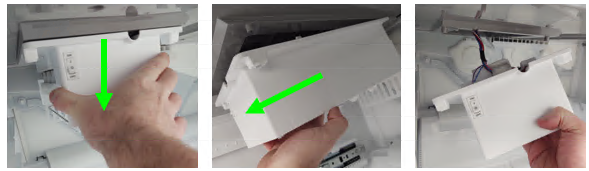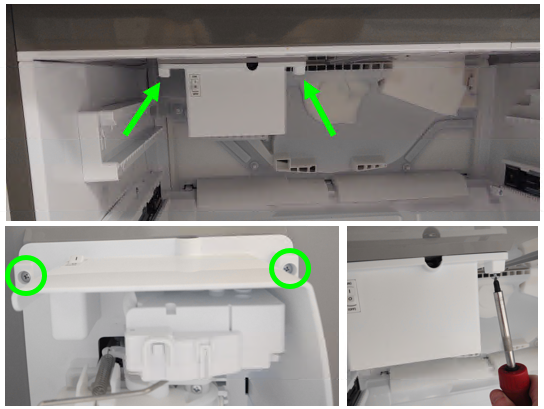 Step 4: After removing both screws pull the icemaker straight down from the front and once the front is loose pull the icemaker forward to uninstall from the rear mounts: