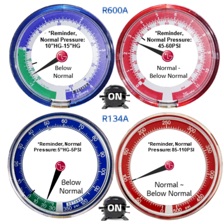A restriction after drier will show Low Side pressure below normal (typically deep vacuum), and High Side pressure ambient or below normal as indicated in the gauge examples below. Amp Draw and Voltage will be lower than normal. There will be no to very little frost pattern depending on exact location of the restriction.
