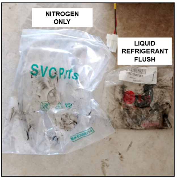 Same unit flushed with only nitrogen first, this is why it is necessary to also flush with liquid refrigerant.