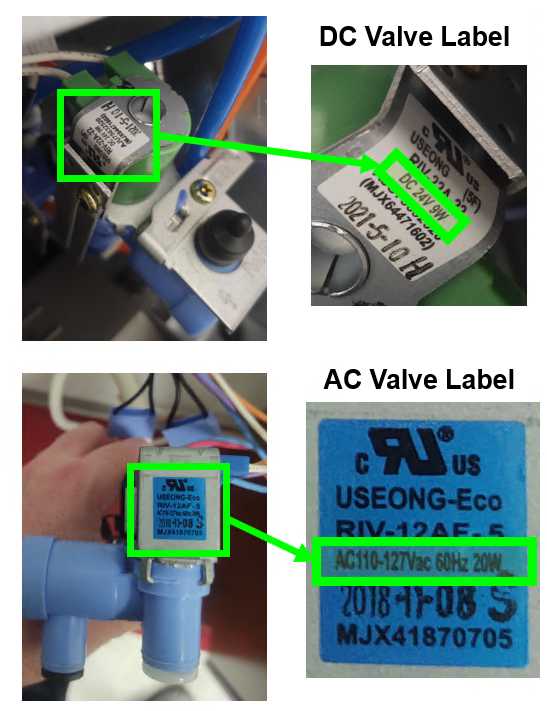 Water Valves used to all be 120Vac but around 2018 LG started using 24Vdc valves. If you are ever in question about what type valve your unit has, there are labels on the valves that show the voltage rating. You can look in the service manual in the troubleshooting portion for water dispenser issues and the voltage will typically be shown there.