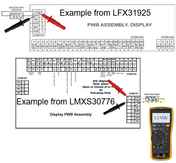 The Pipe Heater should receive 12Vdc constantly to keep it from freezing. If your ice maker is in the Door, with the in-door fill tube it’s voltage may come from various sub-PCB locations, such as, the top of the left-hand door, dispenser board, display board
