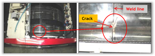 The Dryer Drum can crack at the weld line causing the described noises.