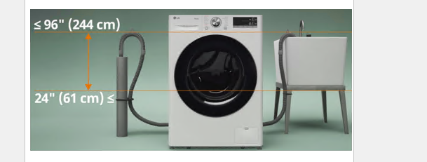 - The end of the drain hose should be located a minimum of 24″ and a maximum of 96″above the bottom of the washer.