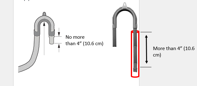 The drain hose entering the standoff, or sink, should have a bend at the end of the hose, (usually there will be an elbow bracket forming a bend), and no more than 4” into the standoff pipe.