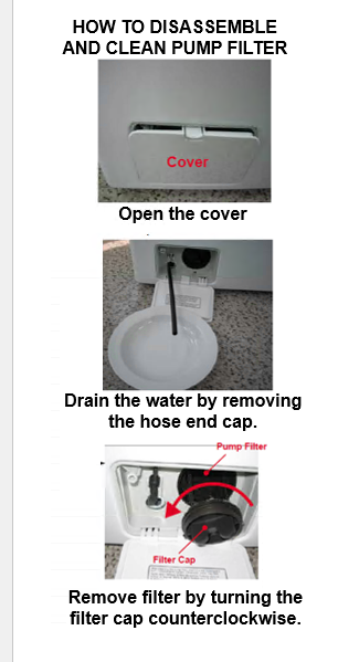 HOW TO DISASSEMBLE AND CLEAN PUMP FILTER. Open the cover. Drain the water by removing the hose end cap. Remove filter by turning the filter cap counterclockwise. Clean the filter. Re-install and close hose cap.